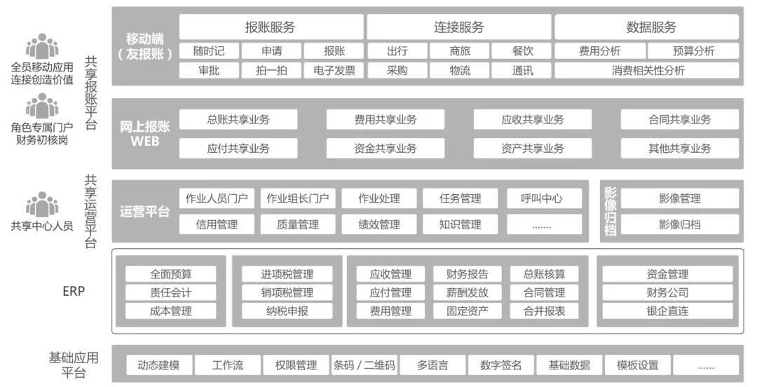 财务共享服务中心致力于打造一体化的集成平台,在基础应用平台的基础上构建财务共享中心前台、中台和后台。